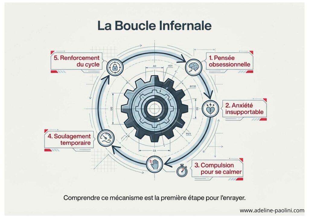 Imagine un engrenage : une pensée obsessionnelle arrive → elle génère une anxiété insupportable → tu réalises une compulsion pour te calmer → tu te sens mieux… pendant quelques minutes. Puis la pensée revient, encore plus forte. Et le cycle recommence.